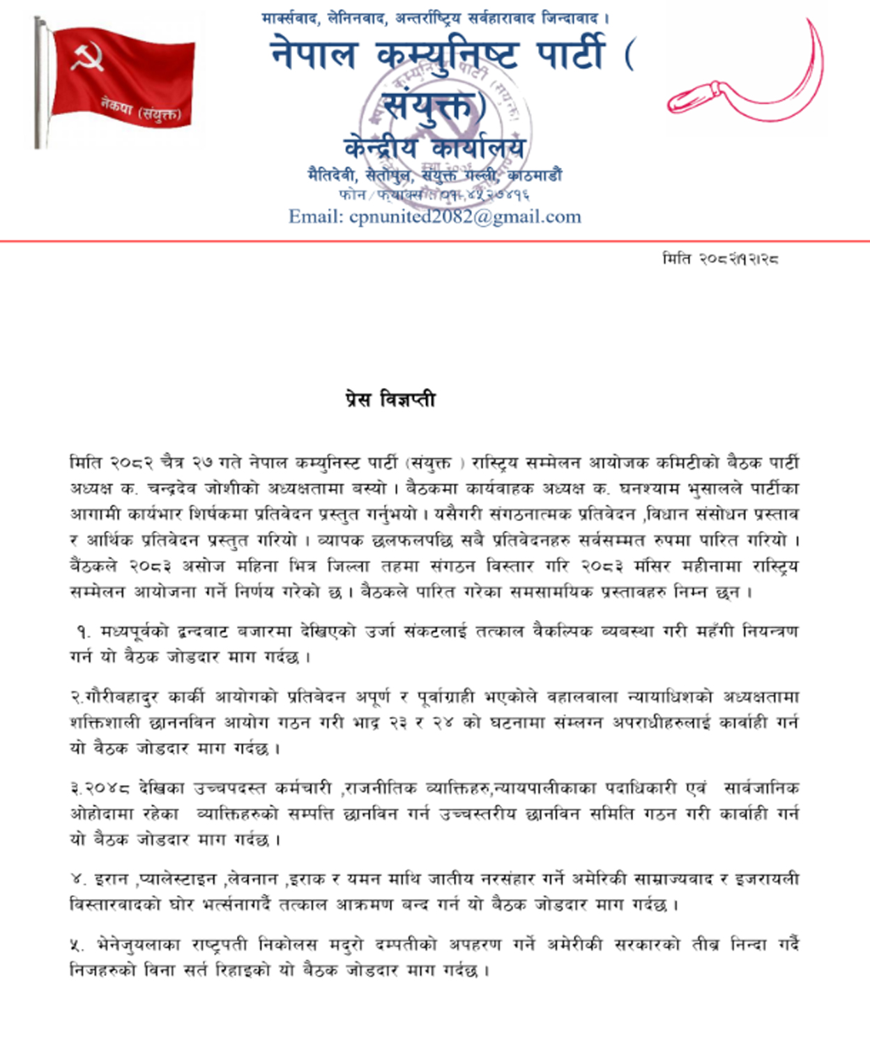 In a statement issued by the acting president of the party, Ghanshyam Bhusal, it is mentioned that 11 points have been decided including various national and international issues.